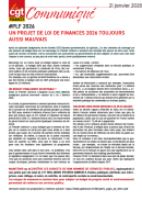 PLF 2026 UN PROJET DE LOI DE FINANCES 2026 TOUJOURS AUSSI MAUVAIS Communiqué de la Fédération CGT Finances du 21 janvier 2026 Après les épisodes budgétaires de fin d’année 2025 (examen parlementaire, loi spéciale...) et des semaines de chantage sur une absence de budget basé sur un (…)