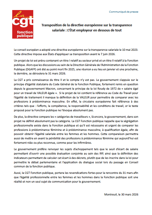 Un projet de loi est prévu contenant un titre I relatif au secteur privé et un titre II relatif à la Fonction publique. Alors que les discussions au sein de la Direction Générale de l’Administration de la Fonction Publique (DGAFP) ont été au point mort fin 2025, une réunion a eu lieu en janvier et une prochaine, la dernière, se déroulera le 31 mars 2026 (lire la suite)