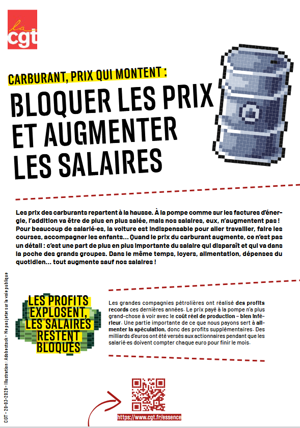 Pour beaucoup de salarié·es, la voiture est indispensable pour aller travailler, faire les courses, accompagner les enfants… Quand le prix du carburant augmente, ce n’est pas un détail : c’est une part de plus en plus importante du salaire qui disparaît et qui va dans la poche des grands groupes. Dans le même temps, loyers, alimentation, dépenses du quotidien… tout augmente sauf nos salaires ! (lire la suite)