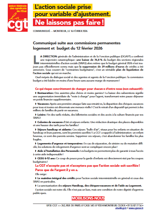 La Direction générale de l’administration et de la Fonction publique (DGAFP) a confirmé une trajectoire catastrophique : une baisse de 76,8 % du budget des sections régionales interministérielles d’action sociale (SRIAS) alors même que le budget général 2026 n’est toujours pas officiellement connu mais que la suppression de 29 millions d’euros de crédits a été annoncée. Sous couvert de "contraintes budgétaires", c’est un véritable plan de liquidation de l’action sociale qui est en marche (....)