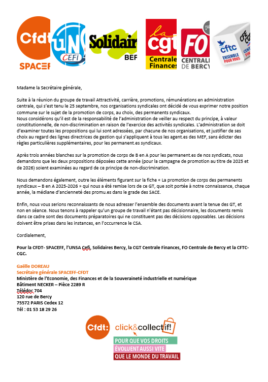 Pour la CFDT- SPACEFF, l’UNSA Cefi, Solidaires Bercy, la CGT Centrale Finances, FO Centrale de Bercy et la CFTC-CGC.