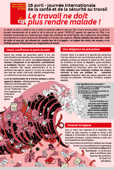 Le travail ne doit ni coûter la vie, ni briser la santé de celles et ceux qui font vivre le service public. Le 28 avril, journée internationale de la santé et de la sécurité au travail, l’UFSE CGT appelle les agent•es de l’État à se mobiliser et participer aux initiatives pour exiger des conditions de travail dignes, des moyens pour les politiques de prévention et un plan santé travail réellement à la hauteur des urgences. Faisons entendre une autre voix : celle de celles et ceux qui refusent de « perdre leur vie à la gagner » et exigent des droits, des moyens, et un véritable pouvoir d’intervention sur l’organisation du travail.